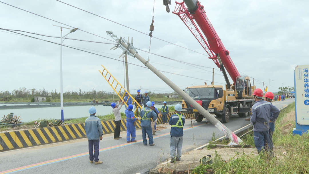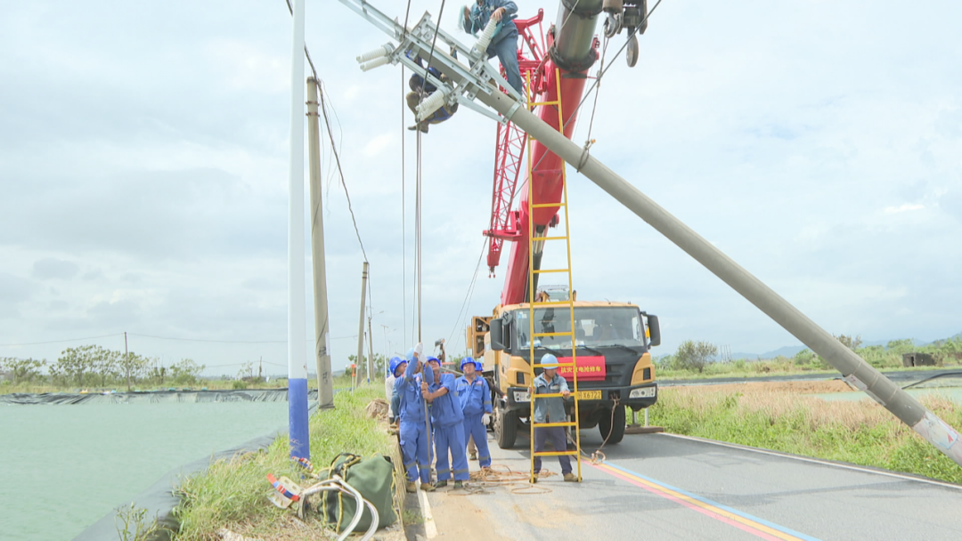 南方電網廣東陽江陽東供電局大溝供電所所長 林進堅: 大溝片區停電以后,這邊養殖戶基本上都停電了。他們養殖期間,都需要電力來供應他們的生產用電,比如進行打氧,因此停電對他們養殖戶以及群眾的生活用電影響都很大。所以我們供電局急群眾之所急,調動各方的力量修復損壞的設備,爭取今天晚上恢復供電。