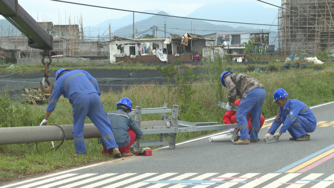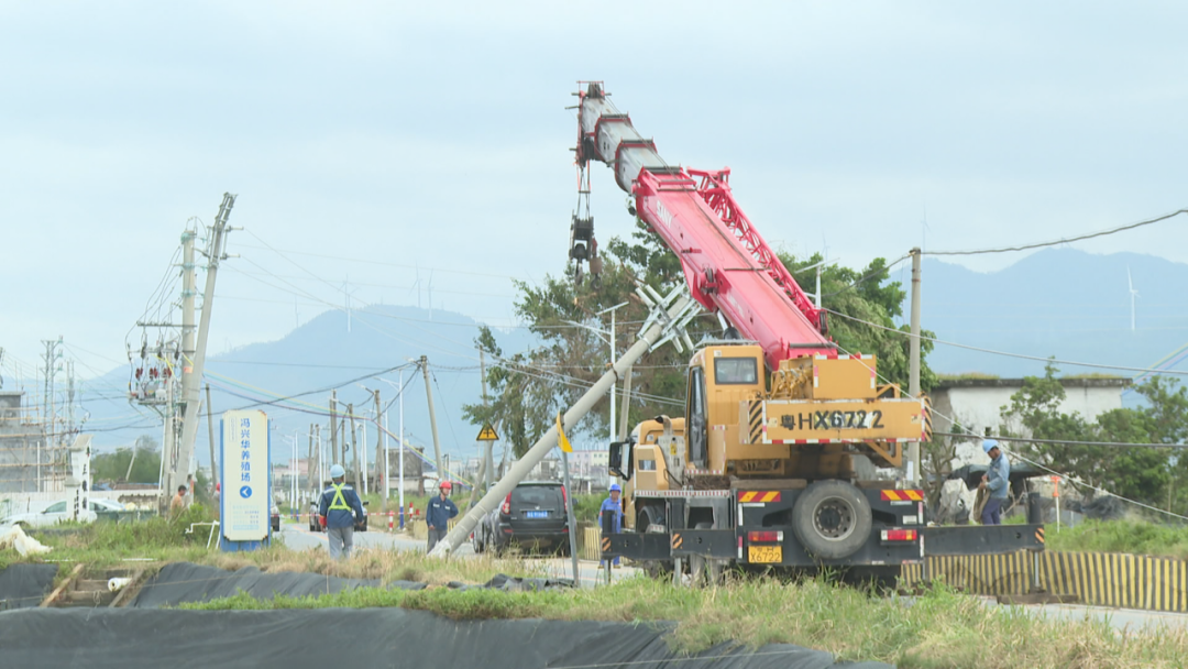 記者前往大溝鎮三丫村“彩虹路”看到,陽東供電局大溝供電所供電人員在10千伏三丫線路開展搶修工作,他們通過吊車吊起、拆除被臺風吹斷倒伏的已損壞電桿,并現場更換新的電桿,在進行線路架設后,施工便完成,基本可以恢復供電。
