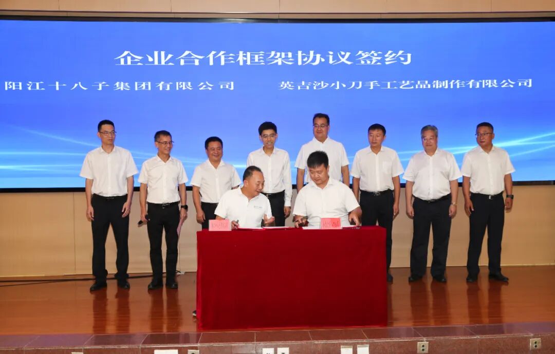 簽約儀式上,分別播放了陽東區和英吉沙縣宣傳片,簽訂了《廣東省陽江市陽東區人民政府 新疆維吾爾自治區英吉沙縣人民政府友好合作框架協議》《廣東省陽江市陽東區人民政府 新疆維吾爾自治區英吉沙縣人民政府共建五金刀剪產業合作平臺框架協議》,以及英吉沙縣小刀手工藝品制作有限公司與陽江十八子集團有限公司合作框架協議。