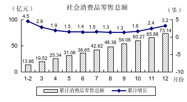 2024年社會消費品零售總額73.14億元,同比增長3.2%。其中,限額以上單位消費品零售額20.77億元,同比增長5.2%;限額以下單位消費品零售額52.37億元,同比增長2.4%。